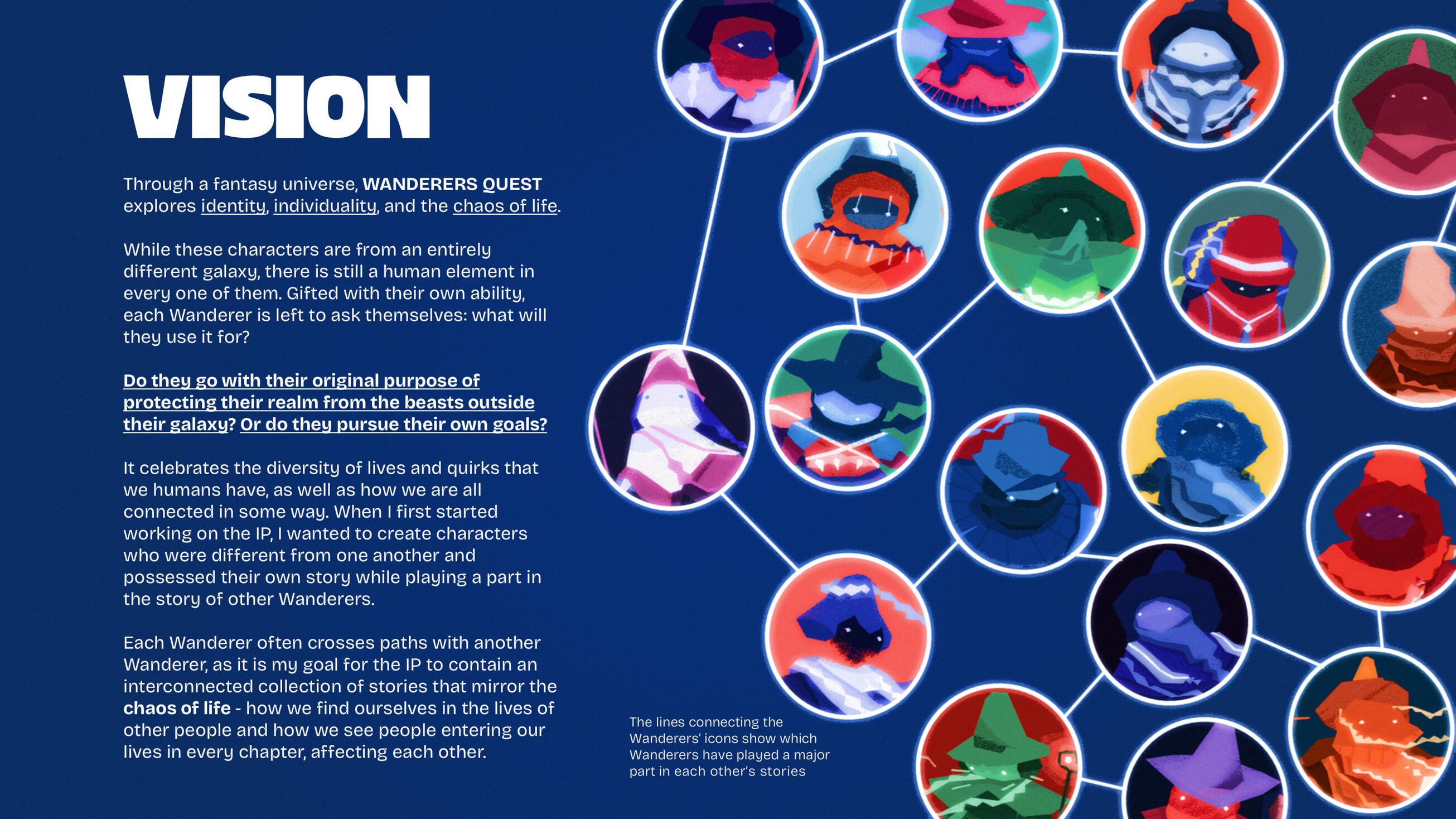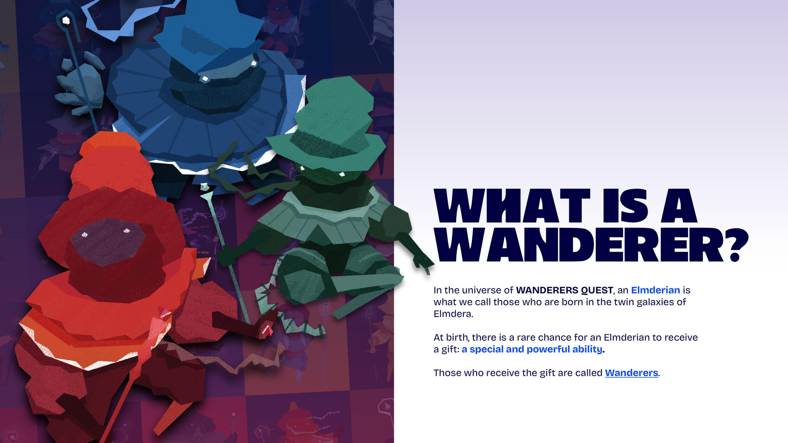 WANDERERS QUEST is a fantasy IP that follows the journey of Wanderers, a subspecies who were gifted with otherworldly abilities and originally entrusted with the purpose to protect their realm, Elmdera, from the colossal beasts that lurk outside their home galaxy.The IP boasts over 40 Wanderers with their own unique abilities, their own journey, and their own ambitions, sometimes conflicting with their original given purpose.